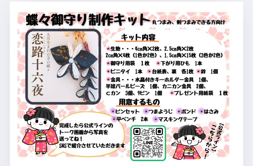 キット内容には、必要な素材や説明書、ラッピング資材が含まれており、つまみ細工経験者の方なら安心して制作に挑むことができます。