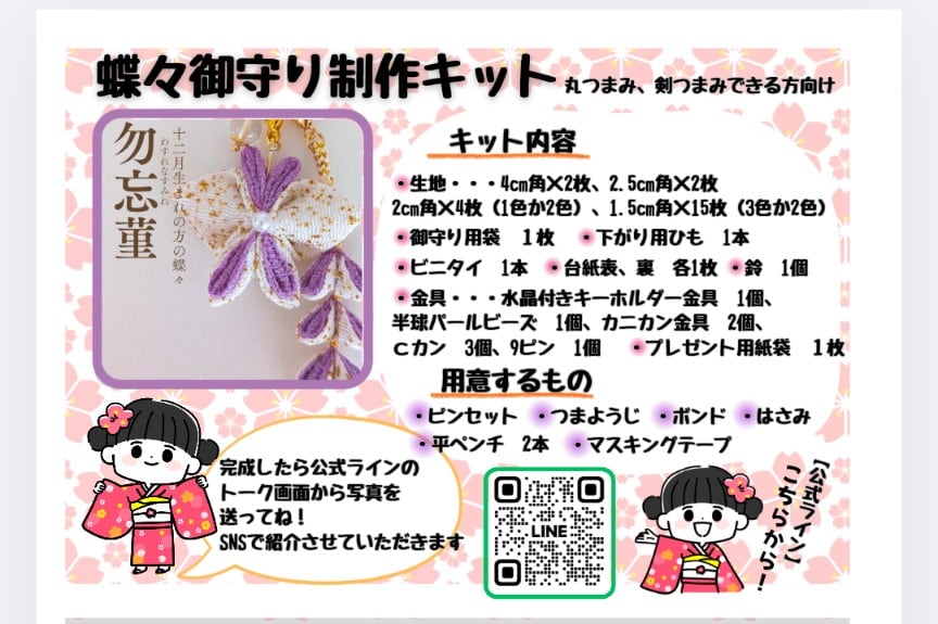 キット内容には、必要な素材や説明書、ラッピング資材が含まれており、つまみ細工経験者の方なら安心して制作に挑むことができます。